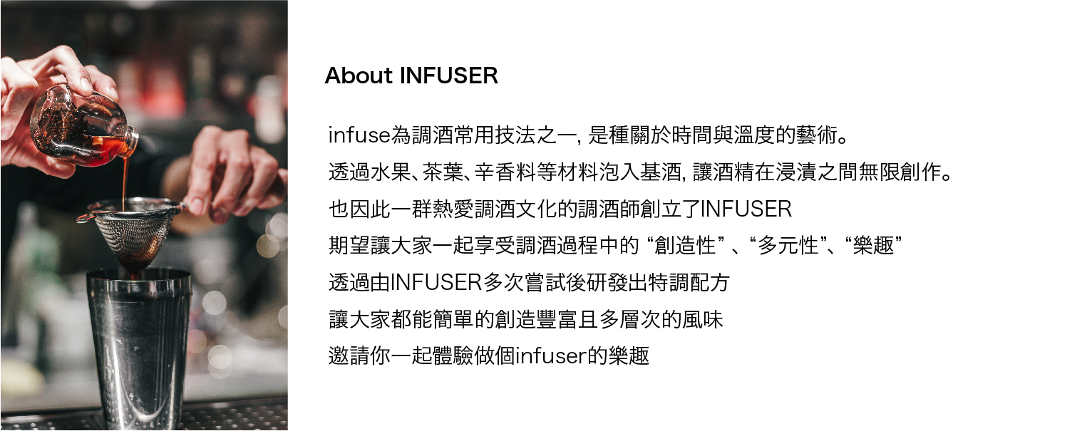 烏龍茶既有綠茶的鮮香濃郁,又有紅茶的甜醇,並且經過焙火後產生的火香及熟果香,非常適合搭配桂花、水蜜桃或是鳳梨,這次Infuser就帶給大家烏龍及鳳梨的結合。這款的浸泡時間可以長一點,大家也可以不要一次全部濾掉,可以慢慢的去感受浸泡時間所帶來的改變,這款非常適合加入薑汁汽水或是薑汁啤酒飲用!